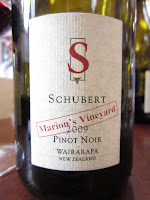 Schubert Pinot Noir “Marion´s Vineyard” 2009 (R$ 198,00) - Varietal 100% Pinot Noir, com 14,5% de álcool, passa por leve maceração a frio,fermentação em cubas de aço mas com posterior passagem de 60% do vinho por 18 mêses em barricas francesas sendo 40% novas. – Granada , ralo, e leve halo de evolução. Olfativamente marcado por flores escuras, couro, framboesa, pimenta e ligeiro toque químico. Na boca, ótima acidez, elegante, taninos doces, ligeira ponta de álcool, corpo médio e final de boca leve  com frutas e ligeiro toque de amendoas. Nota 88/100